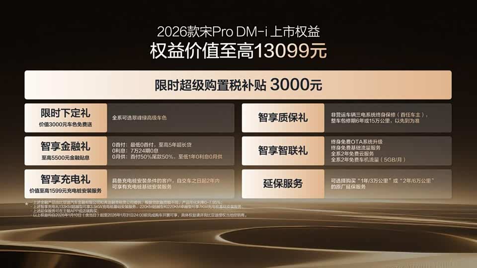 比亚迪正式宣布2026款宋Pro DM-i上新220km长续航版本,全系限时超级优享价9.98-12.78万元。新车以第五代DM技术CLTC纯电续航220km、满油满电综合续航1600km、给城市通勤用纯电,长途旅行一箱油新体验。新增的一体式智能冷暖冰箱、前排座椅通风加热、感触式广角全景天窗、31 色环抱式情景氛围灯,结合15.6寸中控Pad与沉浸式音乐厅级音响,共同营造出高品质的舒适氛围,整车支持OTA远程升级。220KM版搭载的“天神之眼C-辅助驾驶系统”,高快领航辅助(HNOA)可在覆盖路段内辅助驾驶员完成巡航、跟车、自主变道乃至智能上下匝道;针对“停车难”的痛点,窄车位自动收后视镜、车头泊入及偏置泊车等特色功能,新增了高速爆胎稳定控制系统,通过对驱动轮和制动系统的协同控制,有效抑制车辆跑偏与失控,从主动安全的AEB、盲区监测,到被动安全的73%高强度钢车身与6安全气囊,宋Pro DM-i 220km版以更长的纯电续航、更智能便捷的科技配置、更体贴入微的舒适享受和更周全可靠的安全防护,更新了自主品牌新能源的开年之作标杆。