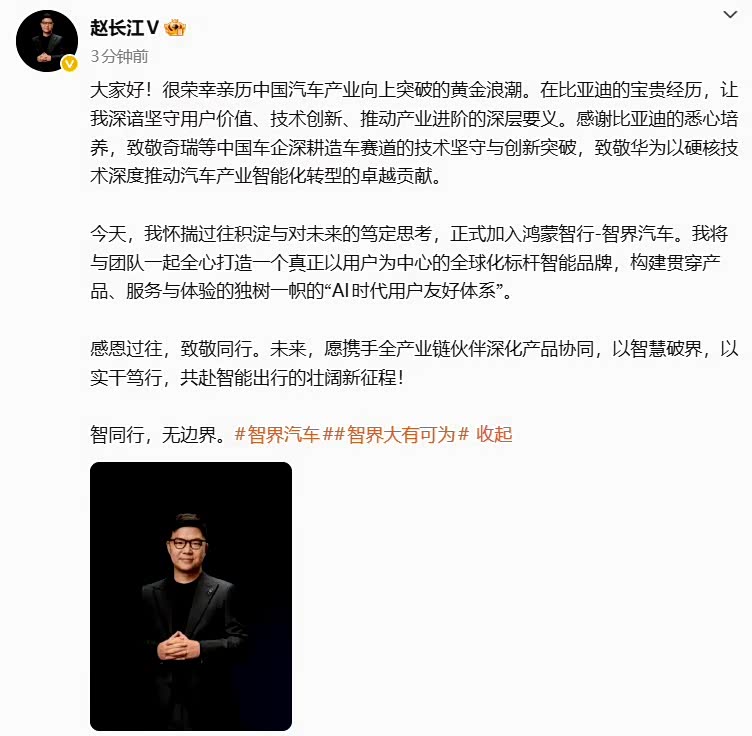 【#赵长江官宣加入智界#】此前备受行业热议的赵长江新去向终于尘埃落地,1月13日,@赵长江v 发博官宣加入智界,出任执行董事及执行副总裁:“今天,我怀揣过往积淀与对未来的笃定思考,正式加入鸿蒙智行-智界汽车。我将与团队一起全心打造一个真正以用户为中心的全球化标杆智能品牌,构建贯穿产品、服务与体验的独树一帜的‘AI时代用户友好体系’。” 1月9日,赵长江曾通过个人微博转发@余承东 智界V9的博文,其IP属地显示为安徽,与智界合作方奇瑞汽车的总部所在地一致。目前,赵长江的官方认证已更新为智界汽车执行董事及执行副总裁。