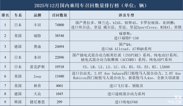 据国家市场监督管理总局缺陷产品管理中心数据,2025年12月共发布乘用车召回公告18则,涉及召回总量共计19.91万辆。分国别来看,日系品牌丰田、本田、雷克萨斯合计召回11.70万辆,占当月召回总量的58.76%;美系品牌福特、Jeep、林肯合计召回5.61万辆,占比28.17%;德系品牌奥迪、大众合计召回2.57万辆,占比12.93%;韩系品牌捷尼赛思召回299辆,占比0.15%。