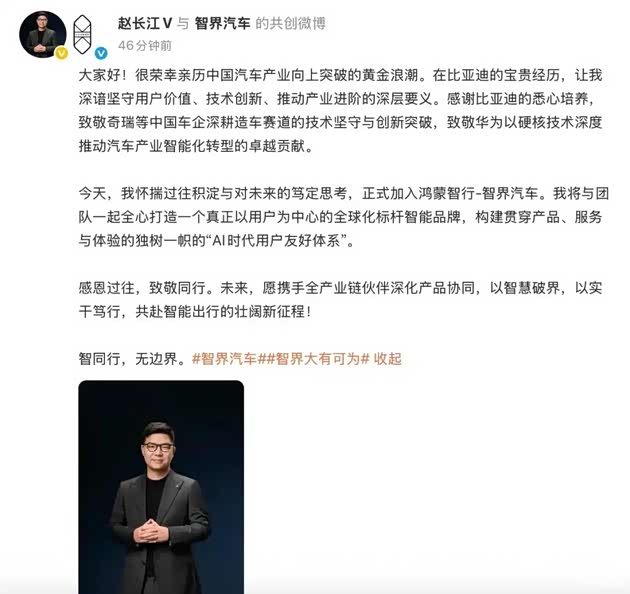 5.比亚迪前高管赵长江加盟智界汽车