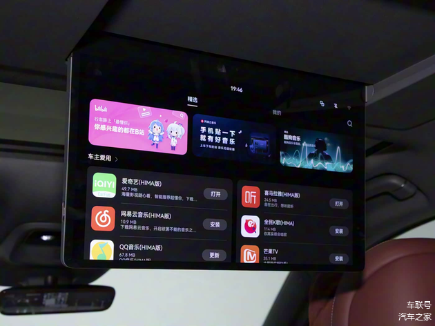 针对后排乘客,新车顶部集成了17.3英寸的高清娱乐屏,支持触控、语音及遥控器操作,结合流媒体后视镜的配置,确保后排观影时不影响驾驶员观察后方视野,实现了全车乘员互不干扰的智能娱乐体验,同时还提供了车载冰箱、负离子发生器等高端配置。
