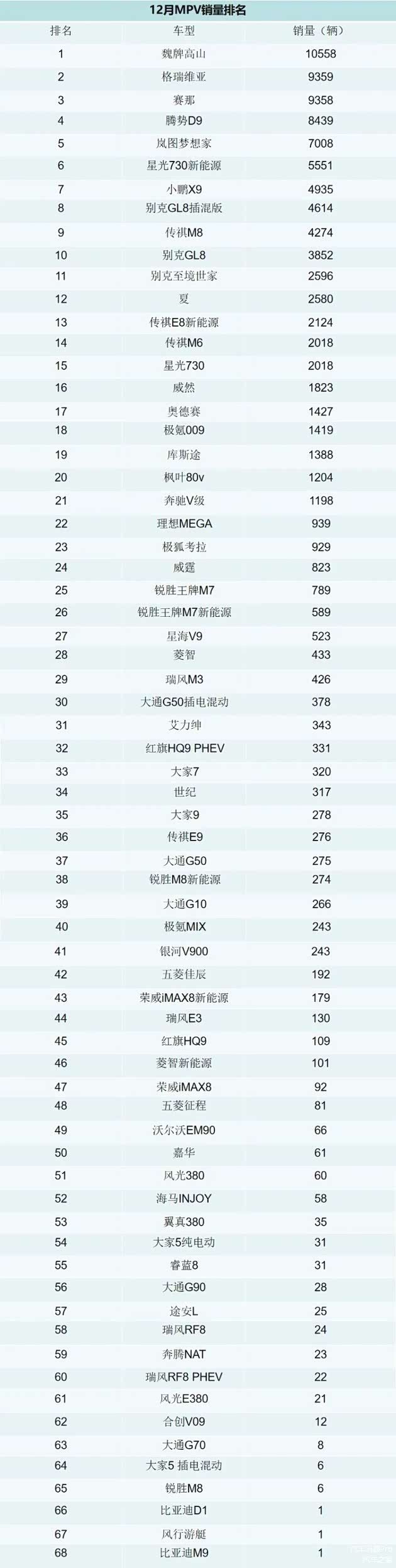 作为2025年最后的“冲刺月”,12月份的重要性不言而喻,车企也都使出全身解数全力冲销量。随着12月份车型销量出炉,本次Pro哥就带大家了解下MPV的销量排名情况。