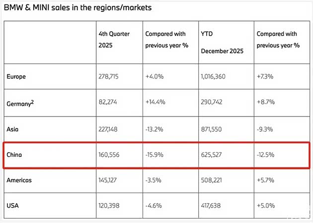 不过亚洲市场,则成为宝马的重灾区,2025年宝马在亚洲的销量为87.16万辆,同比下滑9.3%,其中中国市场全年销量为62.55万辆,虽然仍是宝马最大的单一市场,但销量同比减少约8.9万辆,同比下滑12.5%,第四季度销量更是同比下滑了15.9%。