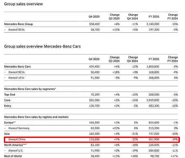 2025年奔驰共售出216万辆乘用车和轻型商用车,其中乘用车全年销量为180万辆,同比下滑9%,全年纯电动乘用车(BEV)与插混(PHEV)车型销量合计36.86万辆,基本与去年持平。