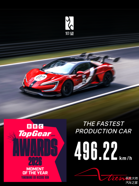 在11月27日,英国权威汽车媒体《Top Gear》将仰望U9 Xtreme达成496.22km/h的成绩评为“年度时刻”,含金量不言而喻。