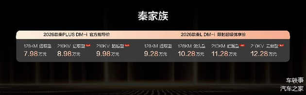 这其中的焦点之一,就是2026款秦L DM-i /2026款秦PLUS DM-i 210KM长续航版双车,售价8.98-12.28万元。其中,2026款秦L DM-i 210KM长续航版限时超级优享价11.28-12.28万元,2026款秦PLUS DM-i 210KM长续航版售价8.98-9.98万元。同时,两款车型均带来了丰厚的上市权益礼。