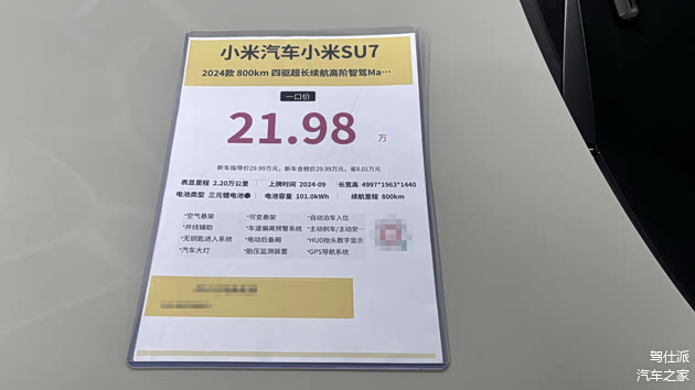 3、还有一台SU7 Max版,指导价同样是29.99万元,但选装了轮毂、内饰、冰箱等,落地价约31.5万元,跑了1.8万公里,现在一口价20.77万元。