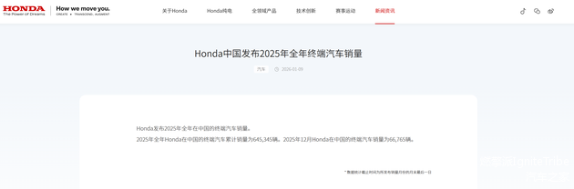 1月9日,本田发布2025年全年在中国的终端汽车销量。2025年全年本田在中国的终端汽车累计销量为645345辆,同比下降24.28%。其中,2025年12月本田在中国的终端汽车销量为66765辆,上年同期为111870辆。