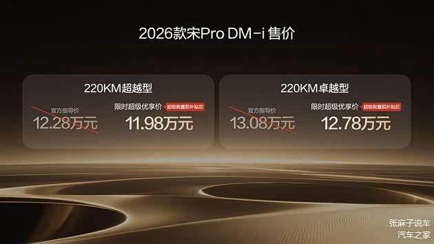 2026年1月10日,比亚迪正式推出2026款宋Pro DM-i 220km长续航版本,限时售价9.98-12.78万元。这款车以220公里纯电续航、1600公里综合续航和3.2L百公里亏电油耗的参数,在10万级SUV市场投下了一枚“价值炸弹”。