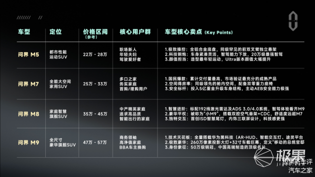在强大体系能力支撑下,问界的市场破局,离不开全矩阵产品体系的强力支撑。通过M5、M7、M8、M9四款核心车型,问界完成了从年轻运动、全能家用到顶级豪华的全场景覆盖,精准匹配了不同消费群体的核心需求,展现出强大的产品竞争力。