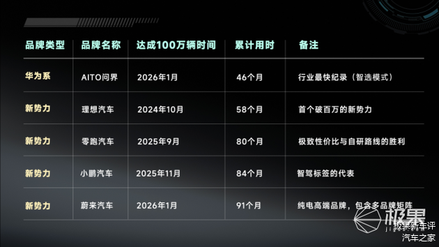 这其中,AITO问界于2026年1月达成这一里程碑,累计用时46个月,刷新行业最快纪录。