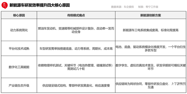 一是平台化、模块化和标准化设计与制造的推动。比起燃油车,新能源车的生产研发体系更容易落地。二是产品研发能力显著提升,数字化、人工智能、虚拟验证这些技术工具普及,彻底颠覆了传统研发模式,很多基础共性技术的研发工作都能提前开展。三是制造与供应链能力增强,这为研发周期压缩提供了实打实的物质保障。