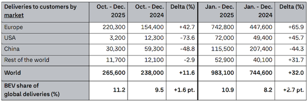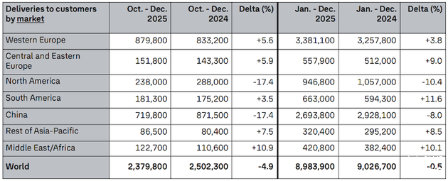 2025年,大众汽车集团全球交付量达898.2万辆(同比微降0.55%),在行业波动中展现体系韧性。纯电动车型成为最大亮点:全球交付98.31万辆,同比激增32%,占比从8.2%提升至10.9%,实现两年内份额翻番。分区域看,西欧市场交付338.11万辆(+3.8%)、中东/非洲市场交付42.08万辆(+10.1%),成为全球业务的稳定支撑;北美市场虽面临供应链压力,但通过产品结构优化仍保持了盈利韧性,为电动化转型提供持续资金基础。