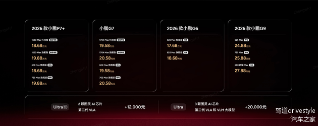 1月8日小鹏全球新品发布会上,小鹏汽车正式发布2026 款小鹏 P7+、小鹏 G7 超级增程、2026 款小鹏 G6、2026 款小鹏 G9。其中2026款小鹏P7+ 全球36国同步发布,新车有超级增程和纯电两种能源形式,超级增程有1550 Max 科技版和1550 Max 旗舰版,官方指导售价为18.68万元和19.88万元;纯电有615 Max旗舰版和725 Max 旗舰版,官方指导售价为18.68万元和19.88万元。2026款小鹏G7推出四个版本,超级增程1704 Max 科技版和1704 Max 旗舰版,官方指导售价为19.58万元和20.58万元;纯电602 Max 旗舰版和702 Max 旗舰版,官方指导售价为19.58万元和20.58万元。2026 款小鹏 G6推出纯电625 Max 科技版和625 Max 旗舰版,官方指导售价为17.68万元和18.68万元。2026 款小鹏 G9推出纯电625Max、725 Max和680 四驱Max版,官方指导售价为24.88万元、25.88万元和27.88万元。