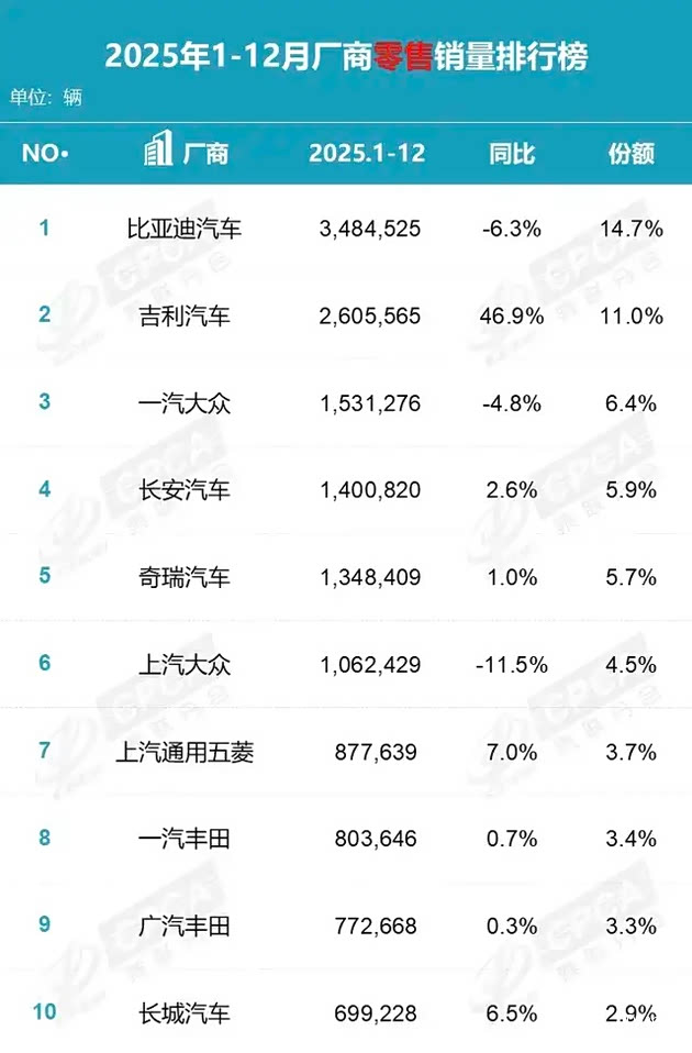 具体到单一品牌,2025年,比亚迪以348.45万辆的销量、14.7%的市占率登顶,成为市场绝对领导者。而曾经的“霸主”大众,即便南北大众合计起来的销量也才259.37万辆,差距显著。