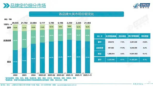 正因为如此,合资品牌近两年市场份额持续萎缩。根据乘联会最新的数据,2025年1-11月,自主品牌的市场份额为65.4%,较2024年提升了4.9个百分点,已然占据市场主导地位;而主流合资品牌的市占率则下降至24.4%,相较于2023年的34.4%下降了10个百分点。