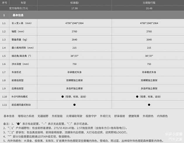 车身尺寸方面,新车的长宽高分别为4790/1940/1964毫米,轴距2760毫米,比燃油版车身高度更高,配合2.5吨拖挂资质,215mm的最小离地间隙、38度接近角、37度离去角,最大涉水深度可达750mm,从数据来看,实用性应该也会不错。
