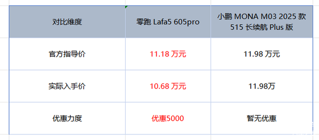 小鹏MONA M03 515长续航Plus版的官方指导价则是11.98万元(目前没有优惠)。单从起售价看,两者都在12万预算内,但是零跑Lafa5 605Pro终端优惠力度较大,两车的实际差价1.3万,对于精打细算的年轻人来说,同样的预算,能省下几千块去升级装备或者多充几年电,无疑是个不错的开场。