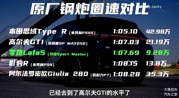 零跑Lafa5的实际操控实力,也在专业测试中交出了一份相当亮眼的答卷。资深汽车媒体极速拍档曾对其进行严苛测评,原装状态下便能跑出1分07秒69的圈速成绩,仅搭配原厂玲珑S轮胎,它的性能就已经逼近高尔夫GTI的水平。除了出色的圈速表现,该车的直线性能同样可圈可点,原厂百公里加速成绩仅为6.84秒,而100-0km/h的刹车距离更是控制在36.49米,这样的硬核数据,在同价位车型中实属难得。