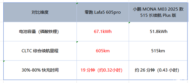 对于电动车,续航是实打实的硬通货。先看核心数据,零跑Lafa5 605pro配备的是67.1kWh的磷酸铁锂电池组,CLTC综合续航里程能达到605km;而小鹏MONA M03 2025款515长续航Plus版搭载的是51.8kWh的磷酸铁锂电池组,CLTC续航则是515km。单看数字就能发现,零跑Lafa5比小鹏MONA M03多了15.3kWh的电池容量,对应的续航里程也多了90km,别小看这90km,日常通勤每天50km的话,零跑能比小鹏多跑将近两天才需要充电,周末想跑个周边城市自驾游,零跑的续航余量也会更让人安心。