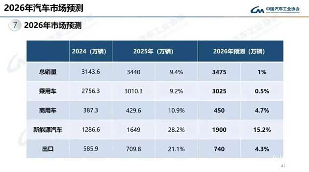 对于2026年国内销量,行业预测存在分歧:中国汽车工业协会的预测是,2026年乘用车市场销量为3025万辆,微增0.5%。
