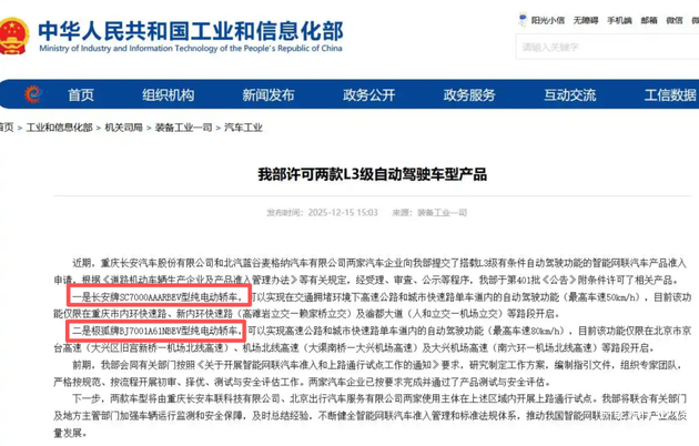 显然,这股自动驾驶的测试风开始于2025年12月15日,工业和信息化部的一纸公告,为这场变革按下了关键的快进键。长安 深蓝SL03与北汽极狐阿尔法S系列成为我国首批获得L3级有条件自动驾驶产品准入许可的车型,获准在北京、重庆部分指定道路开展上路通行试点。
