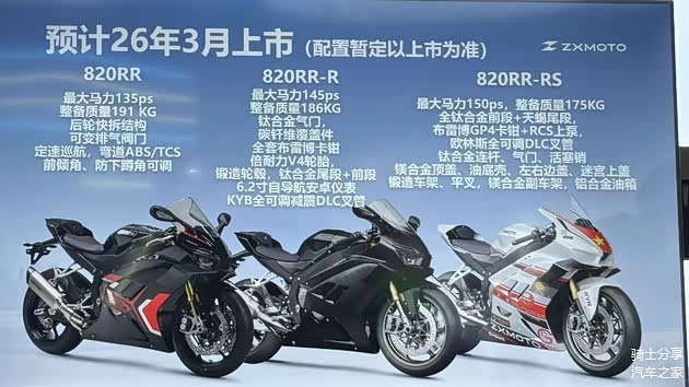 基础版820RR最大马力为135匹,整备质量191kg,具备后轮快速拆卸机构、可变排气阀门。主要配置有定速巡航、弯道ABS和TCS等,另外两个版本的马力会更大、车身会更轻、配置还会更为丰富。