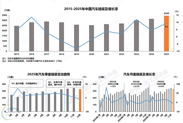 中汽协数据显示:2025年,中国汽车产销分别完成3453.1万辆和3440万辆,同比分别增长10.4%和9.4%,高于年初预期。这一数据意味着中国汽车年产销量连续17年稳居全球第一。