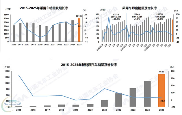 作为汽车产业的核心增长极,2025年我国乘用车产销也再上一个台阶,产销量突破3000万辆——达3027万辆,同比增长10.2%;销量达到3010.3万辆,同比增长9.2%。