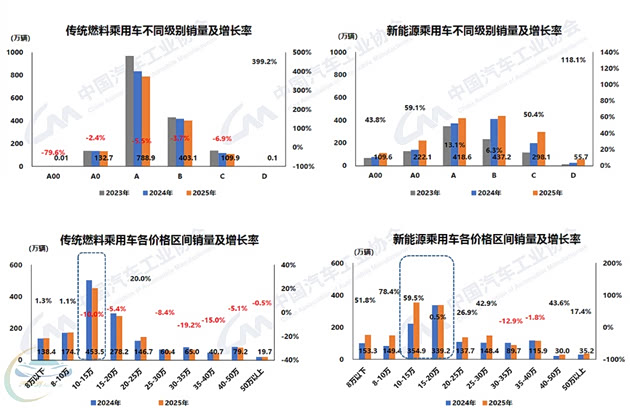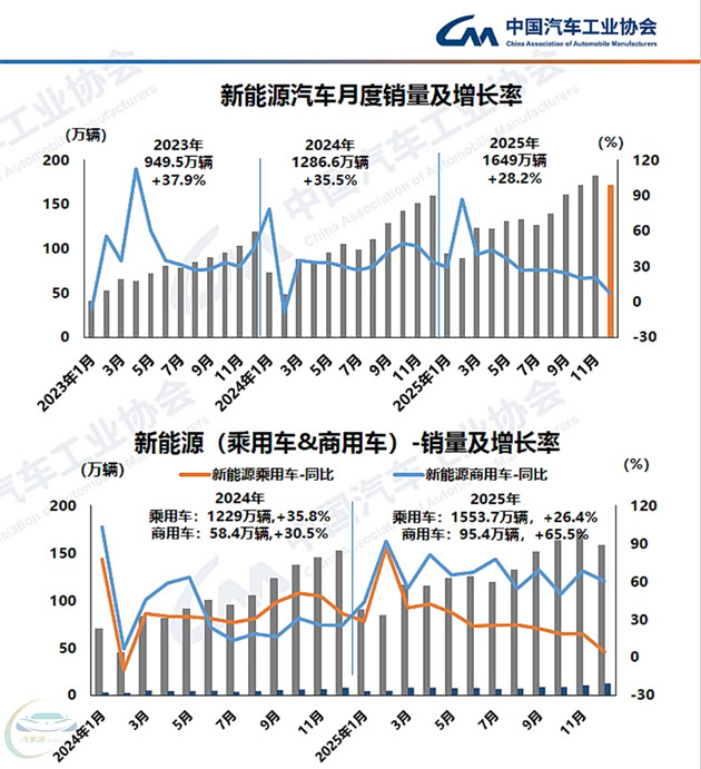 乘用车两大板块之中,2025年传统燃料乘用车国内销量为1106万辆,比去年同期减少49.7万辆,同比下降4.3%。相比之下,新能源汽车的增长显著,2025年,新能源乘用车国内销量达到了1300.5万辆,同比增长17.7%。相比增长率更高的是新能源商用车——销量87.1万辆,同比增长了63.7%。