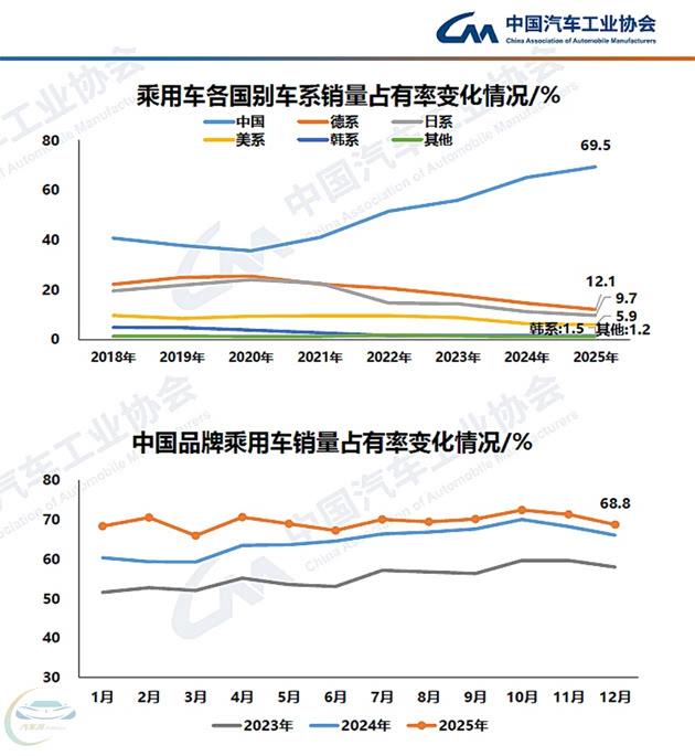 不过,市场角逐激烈,去年12月,中国品牌乘用车销量195.8万辆,同比下降了5.1%,但销量占有率相比2024年同期上升了2.7%,达到了68.8%。