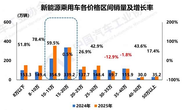 从价格区间来看,2025年新能源乘用车中,30万-40万价格区间销量同比下降,其他价格区间销量均呈正增长。目前销量主要集中在10万-20万价格区间,累计销量694.1万辆,同比增长24%。