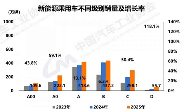 从车型级别来看,2025年新能源乘用车中,各级别销量均呈不同程度增长。目前销量主要集中在A级和B级,累计销量分别为418.6万辆和437.2万辆,同比分别增长13.1%和6.3%。