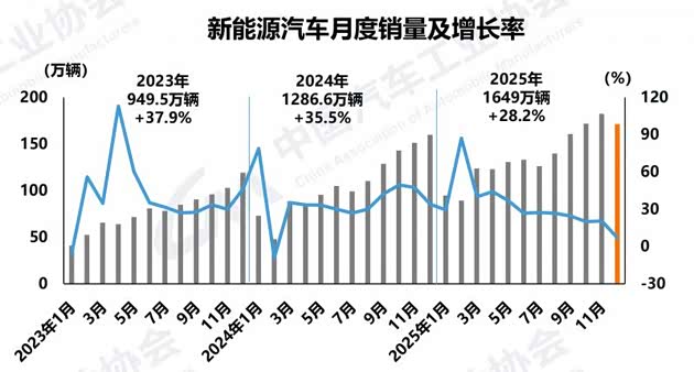新能源汽车依然保持快速增长。2025年12月,新能源汽车产销分别完成171.8万辆和171万辆,环比分别下降8.6%和6.2%,同比分别增长12.3%和7.2%,新能源汽车新车销量达到汽车新车总销量的52.3%。