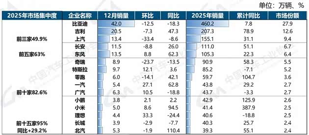 重点企业集团销量方面,2025年新能源汽车销量排名前十五位的企业集团销量合计为1566.9万辆,同比增长29.2%,占新能源汽车销售总量的95%,高于上年同期0.7个百分点。