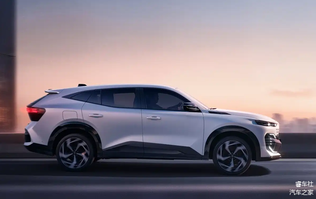 新车侧面有着典型的轿跑风格,车顶从A柱开始下压,带来明显的溜背感。下舷窗从后车门开始上翘,终于和上舷窗在车尾交汇,构成一个锋利锐角,更加凸显动感。车身还利用型面的起伏塑造了充足的肌肉和力量感,涡轮式样的金属切削的轮圈,即便安静停泊,依然带来动势感。