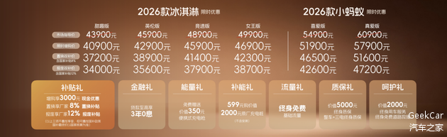 1月10日晚,奇瑞汽车在安徽芜湖凤鸣研创中心成功举行“潮有料开麦夜”暨2026款全新冰淇淋上市发布会。在脱口秀演员Echo与她的朋友们带来的轻松笑谈中,26款全新奇瑞冰淇淋正式上市,宣告“两门高定出行潮品”正式进入市场。共推出四个版本车型,女王版售价38700元起、竞速版售价37900元起、英伦版售价35600元起、甜趣版售价34000元起。同时,全新小蚂蚁也同步推出271km喜爱版与271km真爱版两款车型,真爱版售价47200元起、喜爱版售价42600元起,进一步丰富奇瑞新能源在微型纯电市场的产品矩阵。