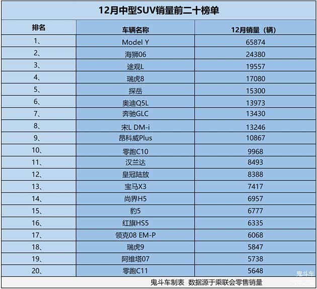 那么,哪些中型SUV更值得他们关注?不妨看看2025年12月中型SUV销量榜单。为了让网友们看得更清楚,鬼哥根据乘联会零售销量数据,整理出12月中型SUV排名前二十的销量榜单。接下来,看看哪些车型卖得好?为消费者提供参考。