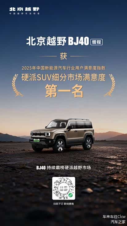 这份成功,也获得了权威品质机构的印证。在中国质量协会2025年新能源汽车用户满意度指数测评中,BJ40增程荣获硬派SUV细分市场用户满意度第一。同时,北京越野品牌也获评 “市场质量信用AAA企业”。销量与口碑的双重认可,让来自国家殿堂的荣誉,在用户端得到了扎实的回响。