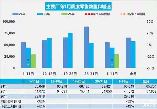 据乘联会公布的相关数据显示2026年1月1~11日,全国乘用车市场零售32.8万辆,同比下降32%,环比下降42%。其中,新能源车零售11.7万辆,同比下降38%,环比下降67%。也就是说真的是天崩开局了,不知道那些天天鼓吹大卖的车企的车都卖去哪里了!