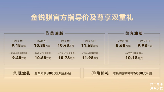 作为主要面向商用市场的皮卡车型,金锐骐此次继续提供汽油、柴油双动力。其中,新车的三款汽油版指导价9.18万-10.18万、八款柴油版车型指导价9.18万-11.98万。作为经历20年发展历程的经典皮卡车型,锐骐家族作为细分市场内的元老级IP,早已得到了大量用户认可。