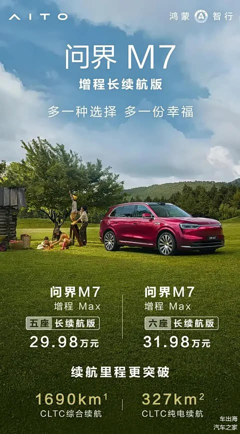 近日, 问界M7增程长续航版正式上市,新车推出两款配置车型,官方指导价分别为29.98万元与31.98万元,核心亮点是续航进阶。另外,为回馈消费者,官方推出限时购车福利,3月2日前下定即可解锁至高价值6万元的购车权益。
