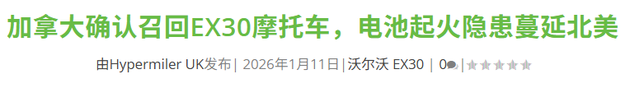 2026年1月11日,据英国Hypermiler汽车媒体报道,因车辆动力电池存在热失控风险,沃尔沃已在美国、加拿大、英国、南非等国家地区,宣布召回 沃尔沃EX30车型。