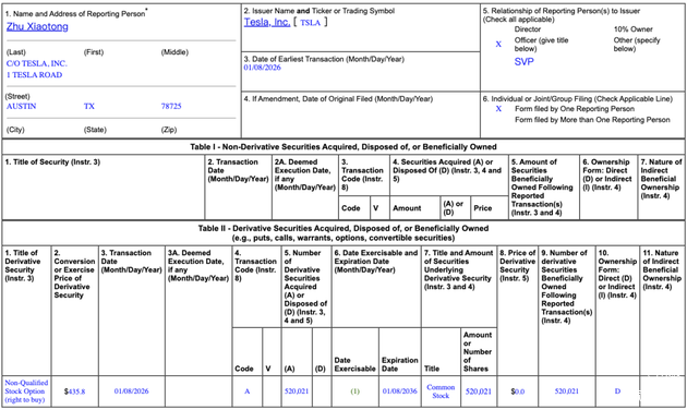 当地时间1月12日,特斯拉向美国证券交易委员会(SEC)提交的一份文件披露,公司高级副总裁朱晓彤获得520,021股股票期权,行权价为每股435.8美元,至2031年3月5日才能完全归属,到期日为2036年1月8日。