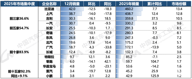从竞争层面来看,去年行业头部集聚效应维持高位,但略有松动。2025年销量排名前15位的汽车集团,合计销量为3174.1万辆,同比增长9.1%,占汽车销售总量的92.3%,较上年同期回落0.3个百分点。