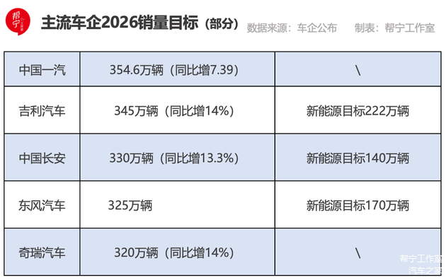 此外,奇瑞汽车目标是320万辆;吉利总目标为345万辆,其中新能源占比64%,为222万辆。