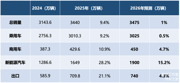 中汽协预测,2026年,国内汽车总销量为3475万辆,同比仅微增1%。其中,乘用车3025万辆,微增0.5%;商用车预计为450万辆,小幅增长4.7%;新能源汽车预计为1900万辆,增长15.2%;汽车出口量预计为740万辆,小幅增长4.3%。