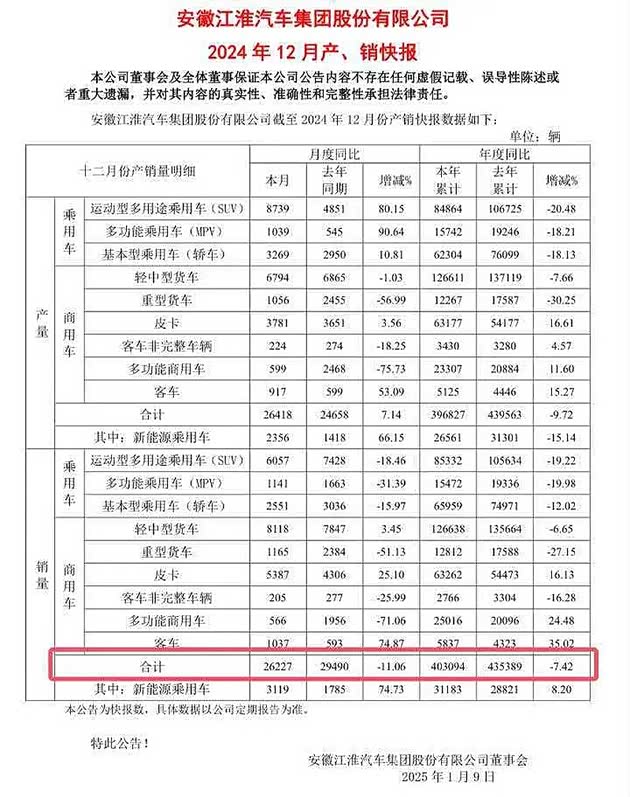 要知道,江淮汽车已经连续2年呈现同比下滑趋势。2024年1-12月份,江淮汽车的累计销量为403094辆,相比2023年1-12月份的销量435389辆,同比下滑7.42%。