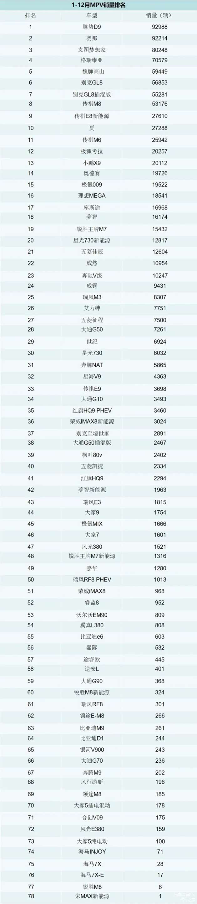 和前两年相比,腾势D9今年的冠军地位没有那么稳固。今年下半年开始,诸多的竞品合力围剿让腾势D9销量一度陷入低谷,若不是12月份力挽狂澜拿下超8000台销量,腾势D9很大可能就会被丰田赛那翻盘。赛那兄弟车型格瑞维亚成绩一直都不错且稳定,今年总销量70579辆,排在第4。