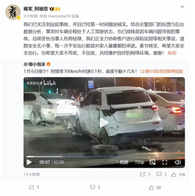 据媒体报道,1月6日傍晚,南宁五象大道地铁4号线楞塘村站附近发生一起令人揪心的连环追尾事故。一辆阿维塔电动车以超过100公里/小时的速度从后方高速冲入正在等红灯的车流中,接连撞击前方15辆正常停驶的车辆,现场碎片四溅、车辆损毁严重,所幸伤者均为轻伤,经及时送医已无大碍。然而,这起事故引发的舆论风暴,却远未平息。